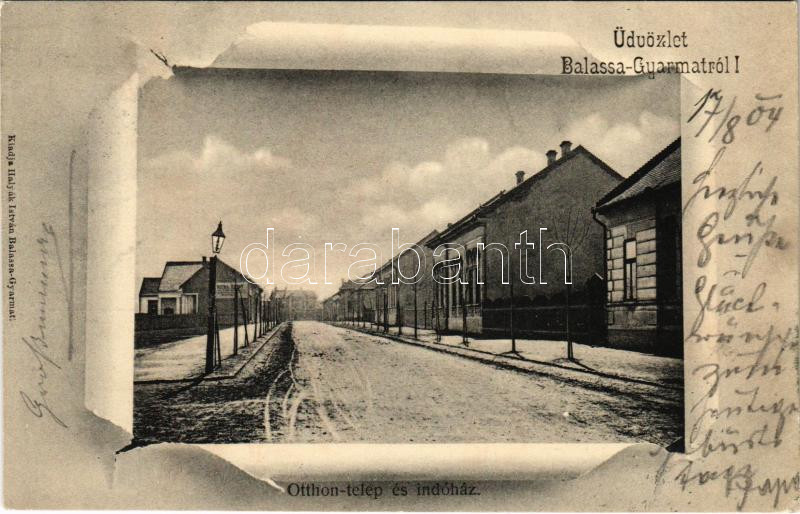 Beschreibung: 1904 Balassagyarmat, Otthon telep és indóház, vasútállomás, Renk Ernő üzlete. Kiadja Halyák István. Art Nouveau