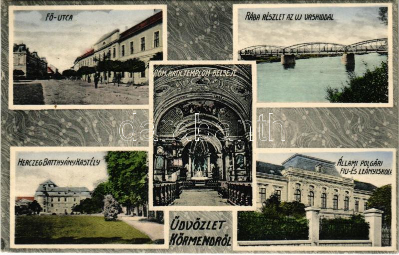 1914 Körmend, Fő utca, Római katolikus templom belseje, Rába részlet az új vashíddal, Herczeg Batthyány kastély, Állami polgári fiú és leány iskola. Art Nouveau