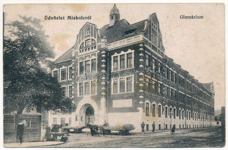 1914 Miskolc, Gimnázium. Grünwald Ignác kiadása (ázott / wet damage) https://www.darabanth.com/de/444-Fernauktion/444.0/Ansichtskarten/Ungarn~2000005/1914-Miskolc-Gimnazium-Grunwald-Ignac-kiadasa-azott-wet-damage~II2934386