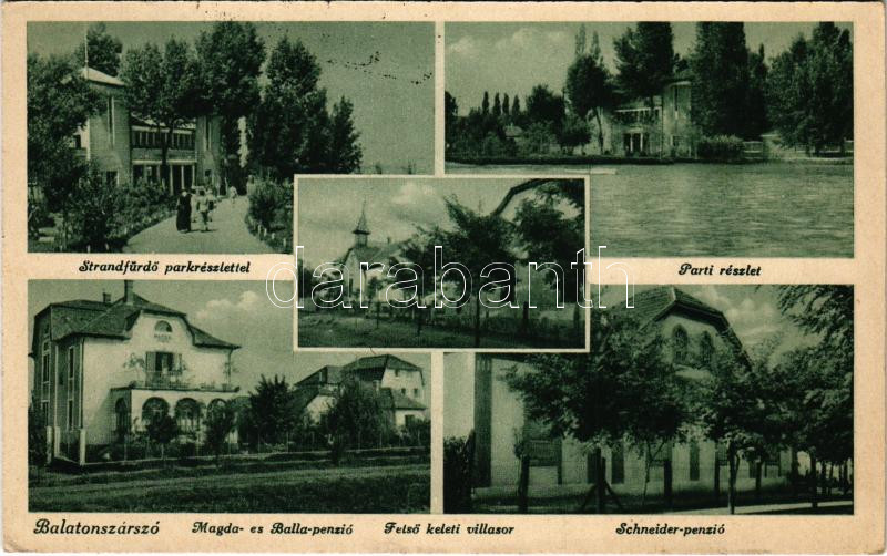 Beschreibung: 1942 Balatonszárszó, Schneider, Magda és Balla penzió, Felső keleti villasor, strandfürdő + "BALATONSZÁRSZÓ P.U. LEVÉLSZEKRÉNYBŐL"