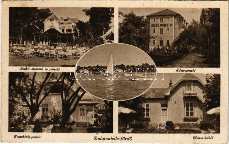 1943 Balatonlelle, Szabó étterem és penzió, Éden penzió, Trombitás pen... https://www.darabanth.com/de/444-Fernauktion/444.0/Ansichtskarten/Ungarn~2000005/1943-Balatonlelle-Szabo-etterem-es-penzio-Eden-penzio-Trombitas-penzio-Maria-udulo-~II2934198