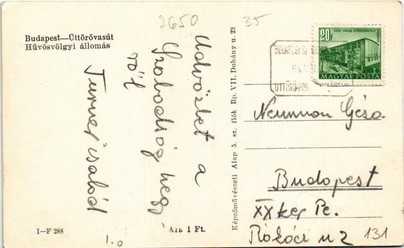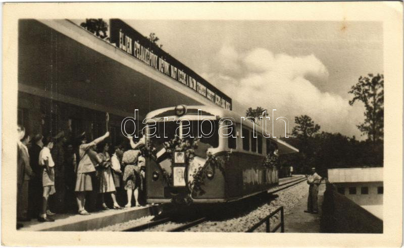 1954 Budapest II. Úttörővasút, Húvösvölgyi állomás "Éljen példaképünk, népünk nagy vezére, a magyar gyermekek szeretett édesapja Rákosi Mátyás!" felirattal, feldíszített vonattal. Képzőművészeti Alap Kiadóvállalat + "BUDAPEST SZÉKESFŐVÁROSI ÚTTÖRŐ POSTAKEZELŐHELY" (EK)