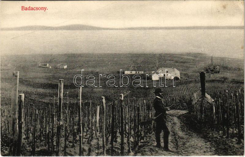 Badacsony, vadász a szőlőben. Mérei Ignác 619. 1909. https://www.darabanth.com/de/444-Fernauktion/444.0/Ansichtskarten/Ungarn~2000005/Badacsony-vadasz-a-szoloben-Merei-Ignac-619-1909~II2930150