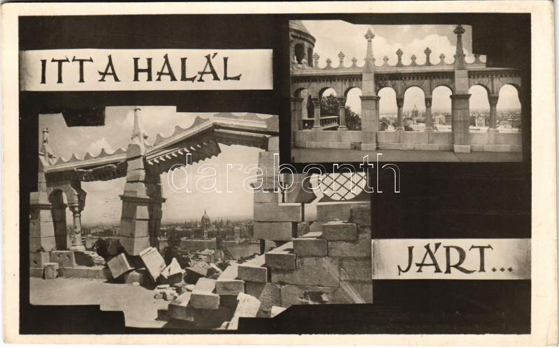 Budapest I. Halászbástya épen és lerombolva. Itt a halál járt... Újjáépítjük Magyarországot! Magyar Újjáépítési Minisztérium engedélyével a Magyar Központi Híradó Rt. propaganda lapja