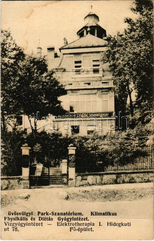 Budapest II. Hűvösvölgy, Park Szanatórium, Klimatikus, Physikális és Diétás Gyógyintézet, Vízgyógyintézet, Elektrotherapia, főépület. Hidegkúti út 78. (EB)
