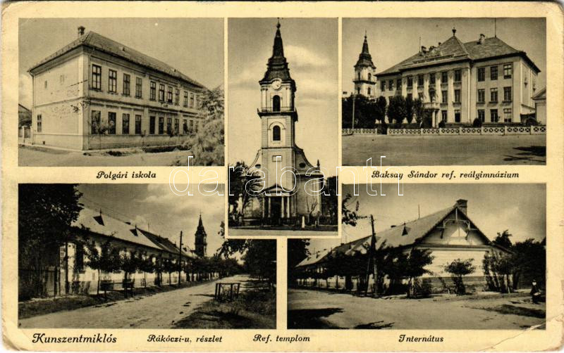 Beschreibung: Kunszentmiklós, Polgári iskola, Református templom, Baksay Sándor református reálgimnázium, Rákóczi utca, Internátus (EB)