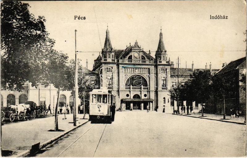 Pécs, Indóház, vasútállomás, villamos (EK) https://www.darabanth.com/de/444-Fernauktion/444.0/Ansichtskarten/Ungarn~2000005/Pecs-Indohaz-vasutallomas-villamos-EK~II2934383