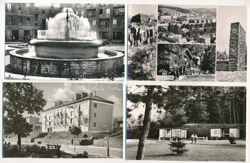 Beschreibung: Salgótarján - 6 db modern Képzőművészeti Alap képeslap (Szökőkút, Sztahanovisták útja, Zagyvapálfalvai kerület, Eresztvény víkendházak, várromok)