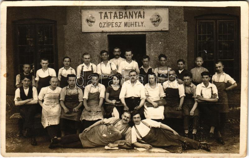 Tatabánya, Cipész műhely, csoportkép. Zsolnin István fényképész, photo... https://www.darabanth.com/de/444-Fernauktion/444.0/Ansichtskarten/Ungarn~2000005/Tatabanya-Cipesz-muhely-csoportkep-Zsolnin-Istvan-fenykepesz-photo-ragasztonyomok-g~II2930082