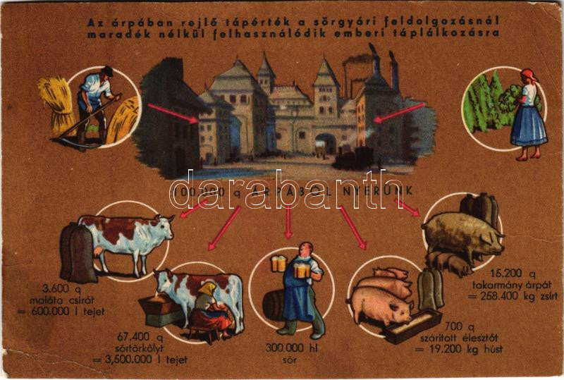 Az árpában rejlő tápérték a sörgyári feldolgozásnál maradék nélkül felhasználódik emberi táplálkozásra. Magyar Söripari Központ reklámja és kiadása / Barley production, Hungarian brewery's advertisement (vágott / cut)