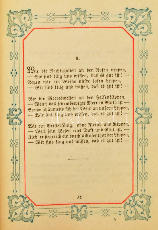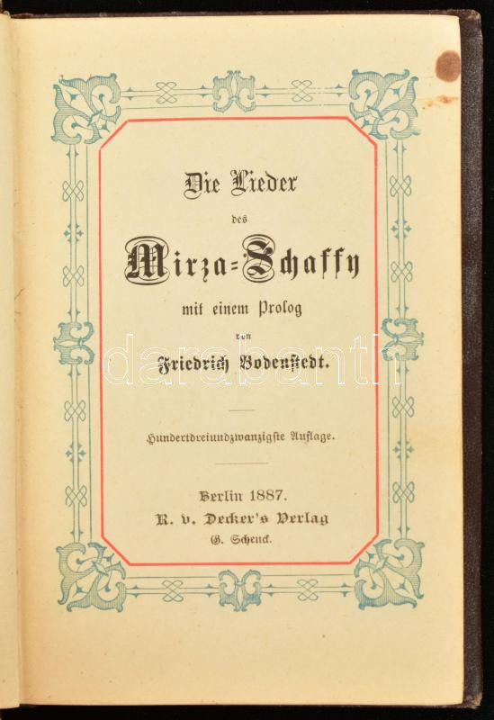 Die Lieder des Mirza-Schaffy mit einem Prolog von Friedrich Bodenstedt. Berlin, 1887, R. v. Decker's Verlag, XXIV+199+(1) p. Német nyelven. Kiadói aranyozott, festett egészvászon-kötés, aranyozott lapélekkel, kissé kopott borítóval, néhány lapon kis folttal.
