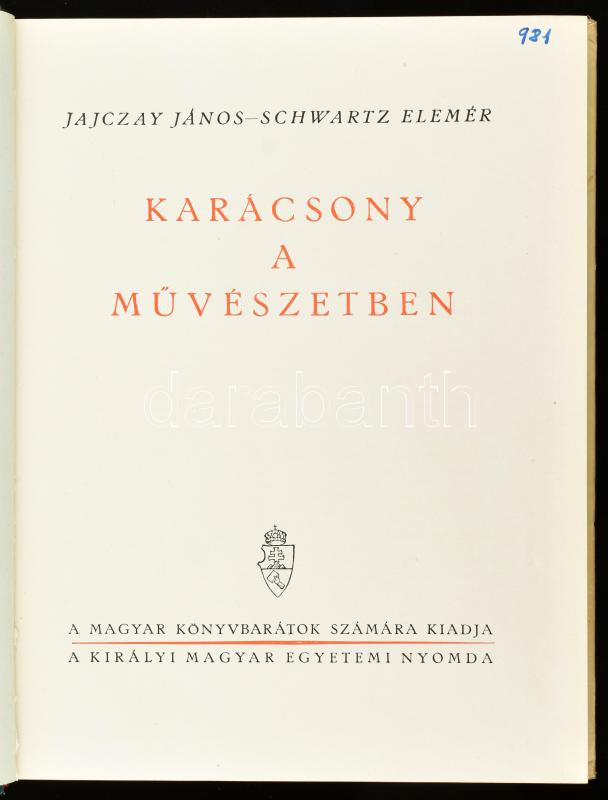 Jajczay János - Schwartz Elemér: Karácsony a művészetben. Bp., (1942),... https://www.darabanth.com/de/444-Fernauktion/444.0/Bucher/Bucher-Andere-kuriositaten~1500027/Jajczay-Janos-Schwartz-Elemer-Karacsony-a-muveszetben-Bp-1942-Kir-M-Egyetemi-Nyomda~II2930100