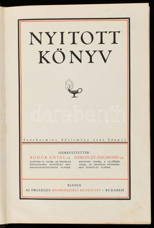 Nyitott könyv. Százharminc közlemény száz képpel. Szerk.: Dr. Bodor Antal, Dr. Gerlóczy Zsigmond. Bp., 1928, Országos Közegészségi Egyesület (Kir. M. Egyetemi Ny.), 320 p + LIII t. Színes és fekete-fehér képekkel illusztrálva. Kiadói aranyozott félbőr-kötés, kissé kopott borítóval.