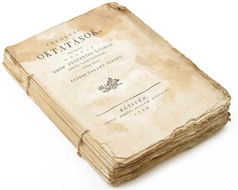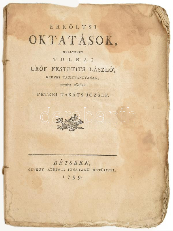 Takáts József, Péteri: Erköltsi oktatások, mellyeket Tolnai gróf Festetits László', kedves tanítvánnyának, szívére kötött ~ ~ Bétsben, 1799. Özvegy Alberti Ignátzné. 392 p. A Magyar Minerva 2. kötete, ami Festetich György támogatásával jelent meg. A szerző (1767-1821) megyei főjegyző, író. Győrben és a keszthelyi Georgikonban végezte tanulmányait. Fűzve, borító nélkül, a 305. oldaltól hiányzó lapokkal