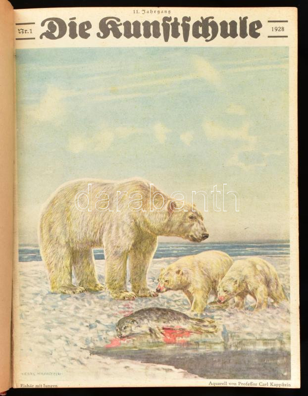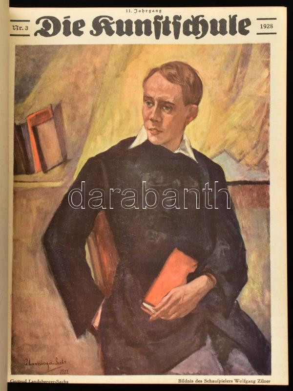 1928 Die Kunstschule. 11. Jahrgang Nr. 1-12. Német nyelvű művészeti folyóirat teljes évfolyama, egybekötve. Gazdag fekete-fehér és színes képanyaggal illusztrálva. Aranyozott gerincű félvászon-kötésben, nagyrészt jó állapotban.