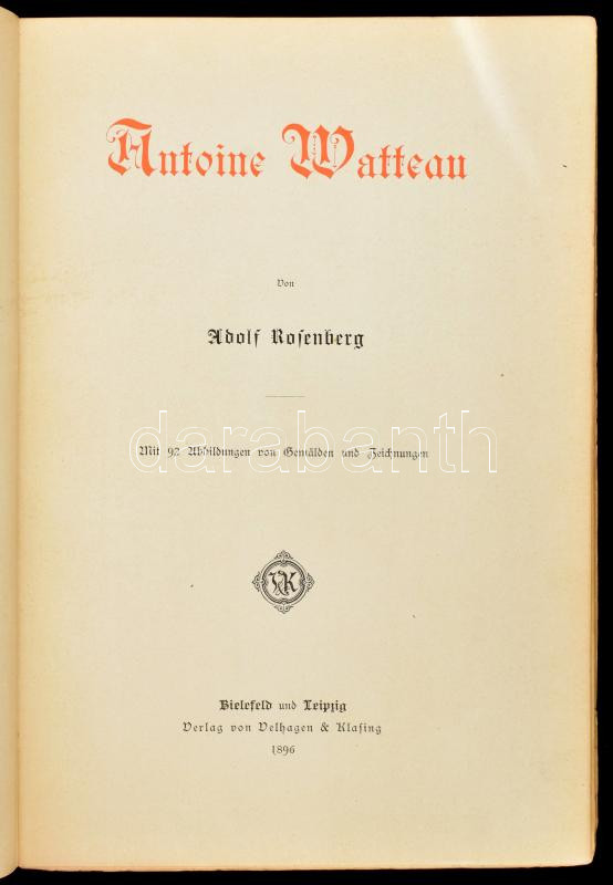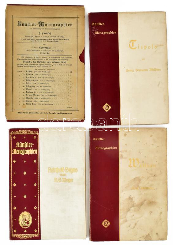 Künstler-Monographien sorozat 4 kötete: Adolf Rosenberg: Antoine Watteau (XV.), Alfred Gotthold Meyer: Reinhold Begas (XX.), Franc Hermann Meißner: Tiepolo, Henry Tode: Correggio (XXX.) Bielefeld und Leipzig, 1896-1898, Velhagen & Klasing. Német nyelven. Gazdag képanyaggal illusztrált. Kiadói aranyozott vászon-kötés, foltos, kopott borítókkal, egy kopott, kissé sérült kiadói kartontokban.