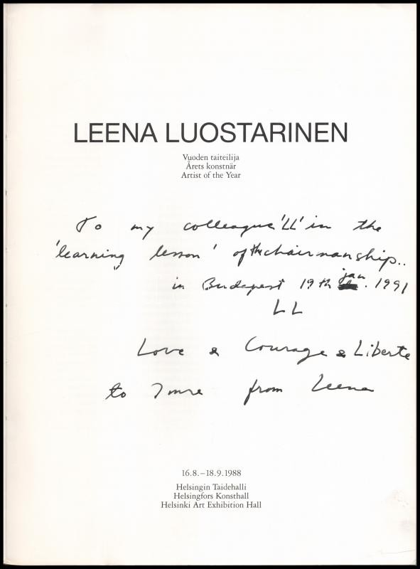 Leena Luostarinen. Helsinki 1988. Art exhibition hall. 96p. DEDIKÁLT k... https://www.darabanth.com/de/444-Fernauktion/444.0/Bucher/Bucher-Architektur-Kunst~1500014/Leena-Luostarinen-Helsinki-1988-Art-exhibition-hall-96p-DEDIKALT-katalogus~II2734067