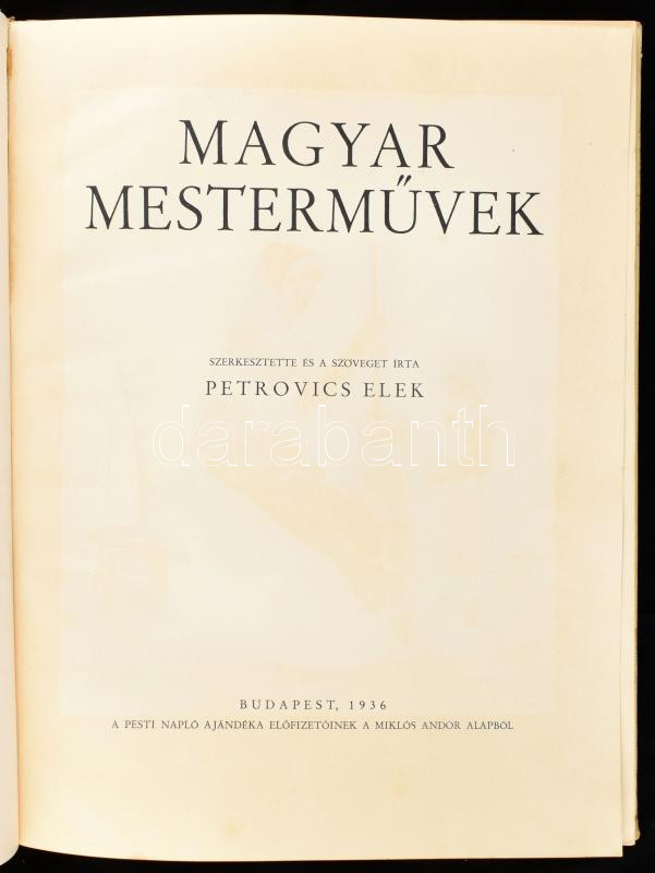 Petrovics Elek: Magyar mesterművek. Bp., 1936, Pesti Napló. Gazdag (nagyrészt fekete-fehér) képanyaggal, többek közt Vaszary János, Rippl-Rónai József, Ferenczy Károly, Berény Róbert műveivel illusztrálva. Kiadói kartonált papírkötés, kopott borítóval, kissé sérült gerinccel.