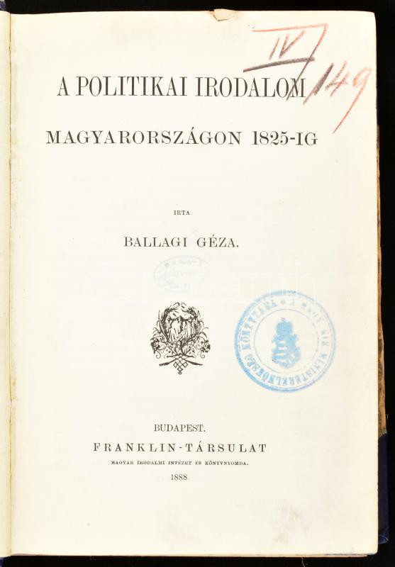 Ballagi Géza: A politikai irodalom Magyarországon 1825-ig. Bp., 1888, Franklin-Társulat, VIII+847 p. Első kiadás. Korabeli félvászon-kötésben, a borítón sérüléssel, kissé fakó gerinccel, néhány kissé sérült lappal, régi intézményi bélyegzőkkel.
