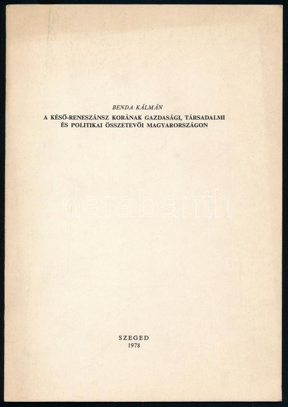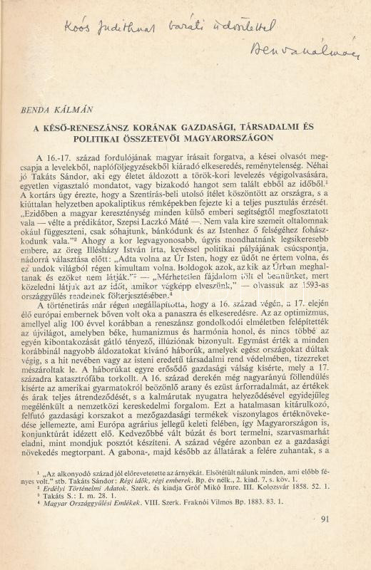 Benda Kálmán: A késő-reneszánsz korának gazdasági, társadalmi és politikai összetevői Magyarországon. A szerző, Benda Kálmán (1913-1994) történész által Koós Judit (1923-2006) művészettörténész, műkritikus részére DEDIKÁLT példány. Szeged, 1978., Szegedi Nyomda, 91-106 p. Különlenyomat. Kiadói papírkötés.