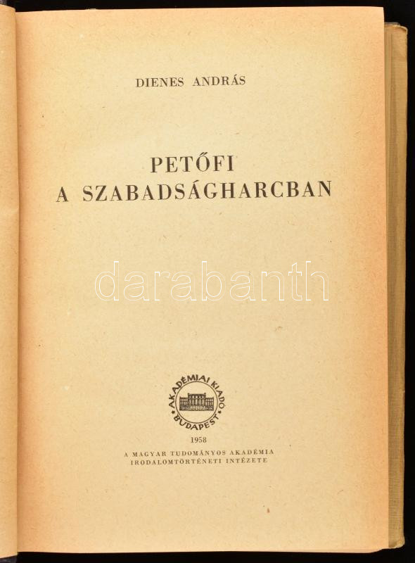 Dienes András: Petőfi a szabadságharcban. Irodalomtörténeti Könyvtár 3. Bp., 1958., MTA Irodalomtörténeti Intézete, 643+3 p.+A-H t. + LXXXIV t. + 2 (melléklet) t. Kiadói egészvászon-kötés, kiadói foltos papír védőborítóban.