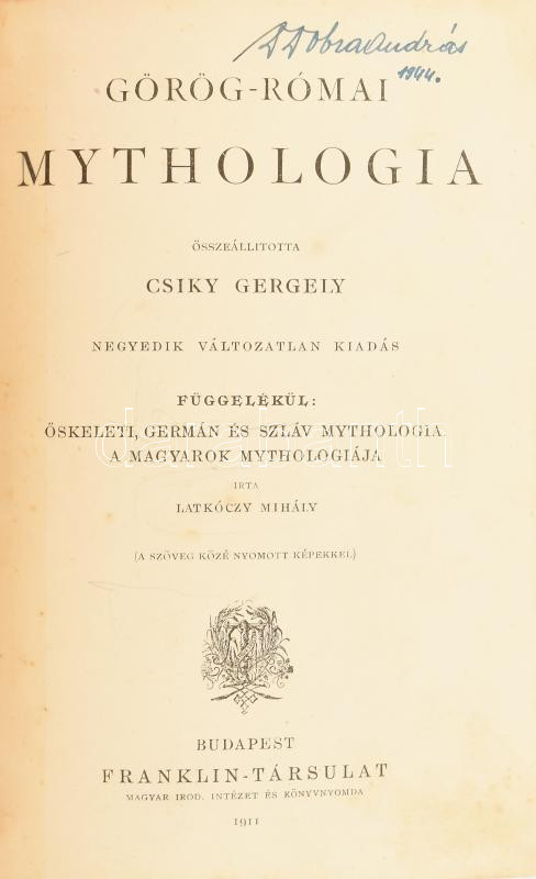 Görög-római mythologia. Összeállította: Csiky Gergely. Függelékül: Latkóczy Mihály: Őskeleti, germán és szláv mythologia. A magyarok mythologiája. (A szöveg közé nyomott képekkel.) Bp., 1911., Franklin, 328 p. Negyedik, változatlan kiadás. Kiadói aranyozott, illusztrált egészvászon-kötés, kopott borítóval,a szövegben aláhúzásokkal.
