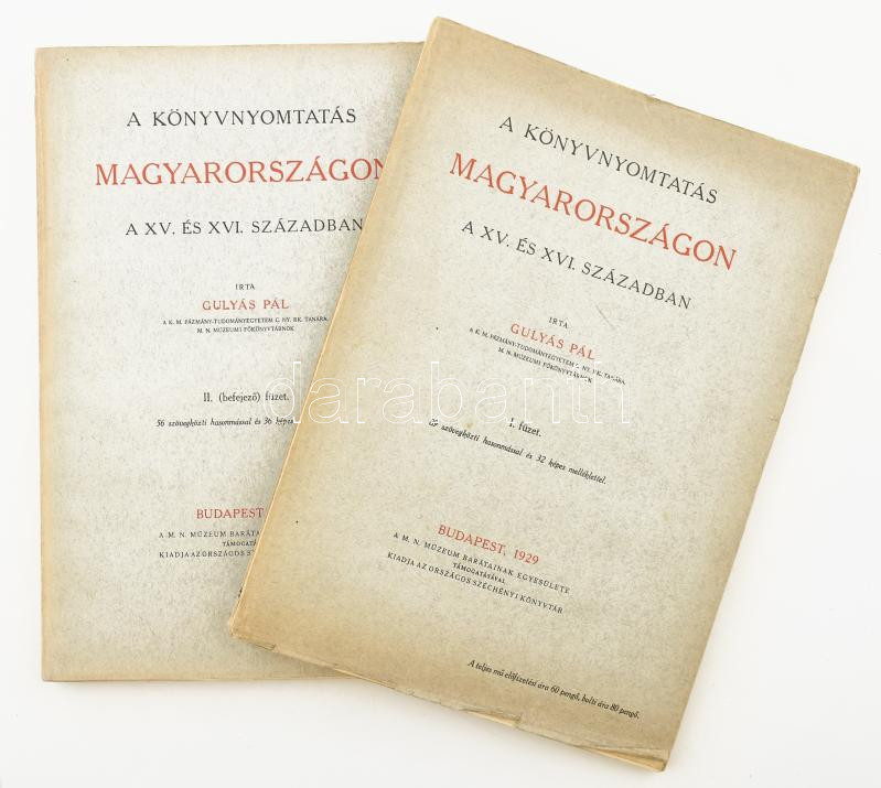 Gulyás Pál: A könyvnyomtatás Magyarországon a XV. és XVI. században I-II. füzet. Bp., 1929-1931., M[agyar] N[emzeti] Múzeum Barátainak Egyesülete támogatásával kiadja az Országos Széchényi Könyvtár,(Stephaneum-ny.), 8+272 p.+ LXVIII t. Gazdag képanyaggal illusztrált. Egyetlen kiadás. Kiadói papírkötés, szakadozott borítókkal.