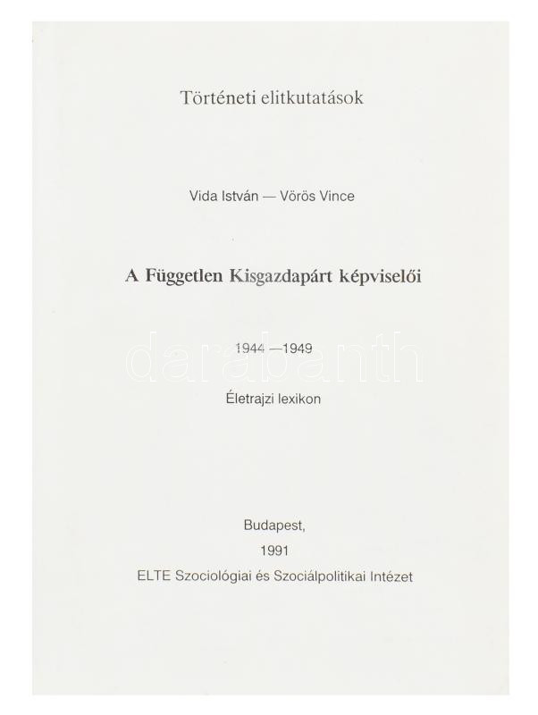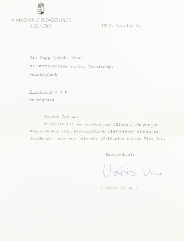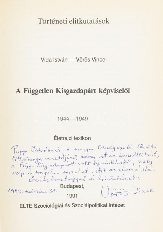 Vida István - Vörös Vince: A Független Kisgazdapárt képviselői. 1944-1949. Életrajzi lexikon. Történeti elitkutatások. Bp., 1991., ELTE Szociológiai és Szociálpolitikai Intézet. Kiadói papírkötés. Az egyik szerző, Vörös Vince. (1911-2001) politikus, országgyűlési képviselő, az Országgyűlés alelnöke (1990-1994) által Dr. Papp Istvánnak az Országgyűlés Elnöki Titkársága vezetőjének részére DEDIKÁLT példány, dátumozva (1992. márc. 31.) + 1992 Vörös Vince könyvhöz tartozó gépelt ajándékozó levele, fejléces papíron, autográf aláírásával.