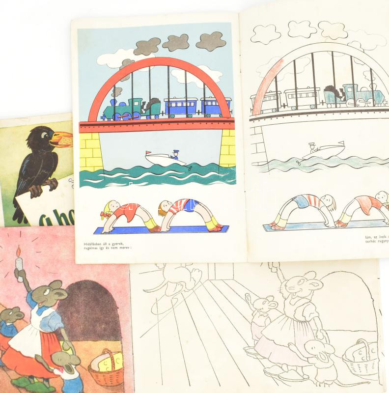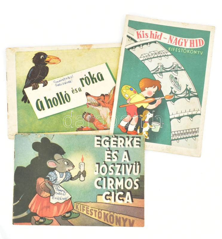 3 db régebbi kifestőkönyv: Macskássy János, Bedő István: Kis hid - nagy hid. Bp., é.n., Szikra Nyomda. Kiadói papírkötés, kifestve, kissé foltos. + Bíró Magda, Rácz Vera: A holló és a róka. Bp., é.n., Szikra Nyomda. Kiadói papírkötés, sérült gerinccel, kissé sérült borítóval, kifestve, kissé foltos. + Németh István: Egérke és a jószívű cirmos cica. Bp., 1955, Révai Nyomda. Kiadói papírkötés, kifestve, kissé foltos.