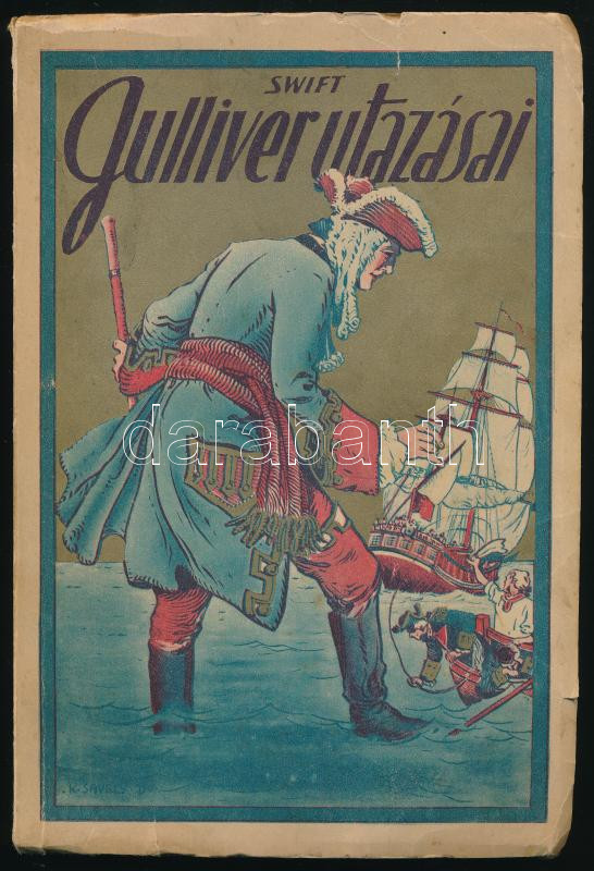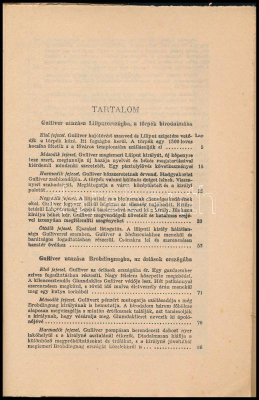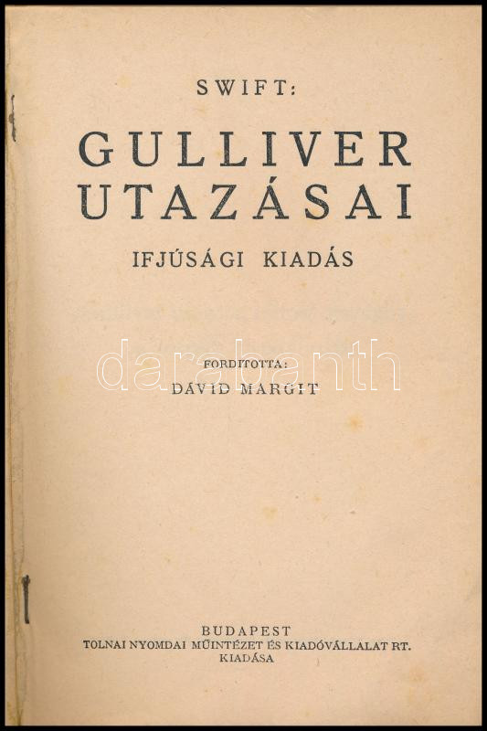 Swift, [Jonathan]: Gulliver utazásai. Ifjúsági kiadás. Ford.: Dávid Margit. Bp., [1937], Tolnai, 154+(6) p. A borító K. Sávely Dezső munkája. Kiadói illusztrált papírkötés, a borítón néhány kis sérüléssel.