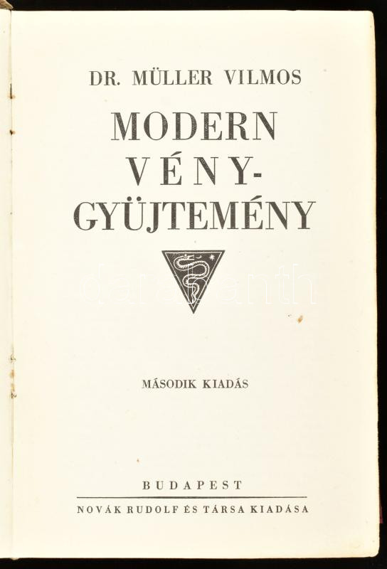 Dr. Müller Vilmos: Modern vénygyűjtemény. Bp., [1932], Novák Rudolf és Társa, 784 p. Második kiadás. Kiadói aranyozott egészvászon-kötés, kopottas borítóval.