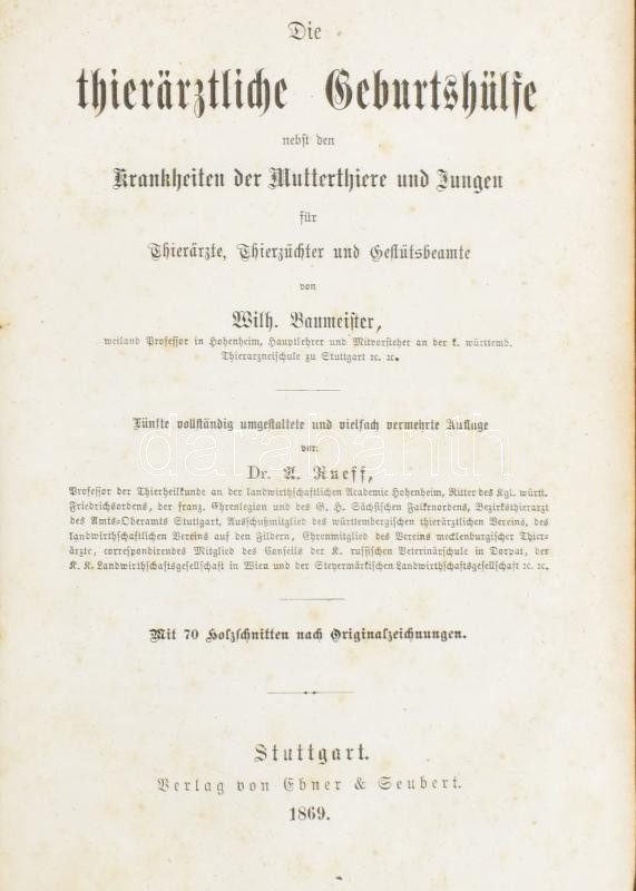 Die tierärtzliche Geburtshülfe nebst den Krankenheiten der Mutterthiere und Jungen für Thierärzte, Thierzücheter und Geflütsbeamte von Baumesiter. Lóellésról szóló könyv Stuttgart 1869.Ebner und Seubert, Német nyelvű, gót. Kopott félbőr kötés.ábrákkal 500 p