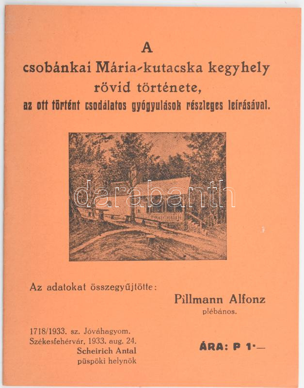 1933 Pillmann Alfonz: A csobánkai Mária-kutacska kegyhely rövid története, az ott történt csodálatos gyógyulások részleges leírásával. Összegyűjtötte: - - plébános. Szentkuti Kápolna Építőbizottság, 4 sztl. lev.