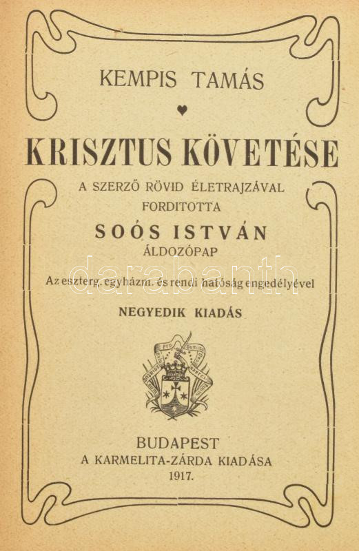 Kempis Tamás: Krisztus követése. A szerző rövid életrajzával. Ford.: Soós István. Bp., 1917, Karmelita-zárda, 367 p. Aranyozott, dombornyomott egészvászon-kötésben, festett lapélekkel, jó állapotban.
