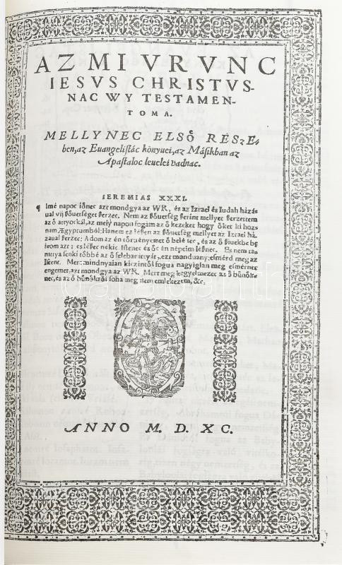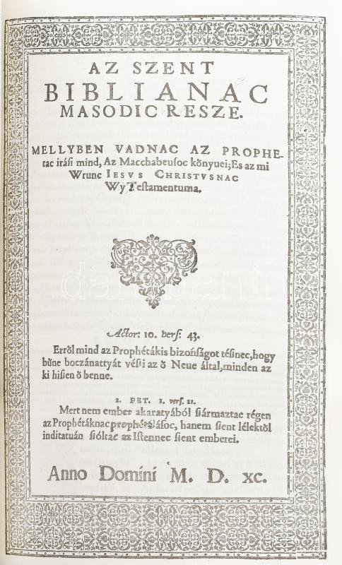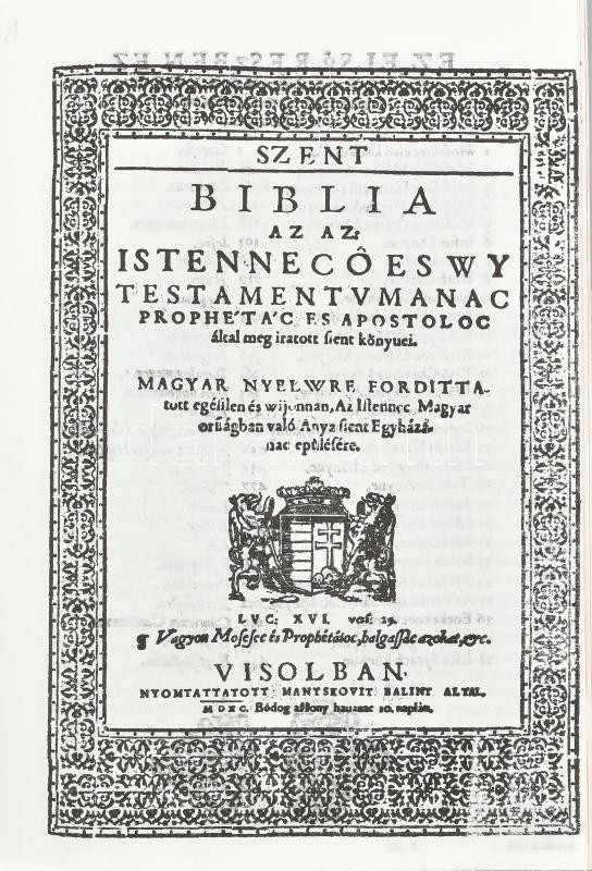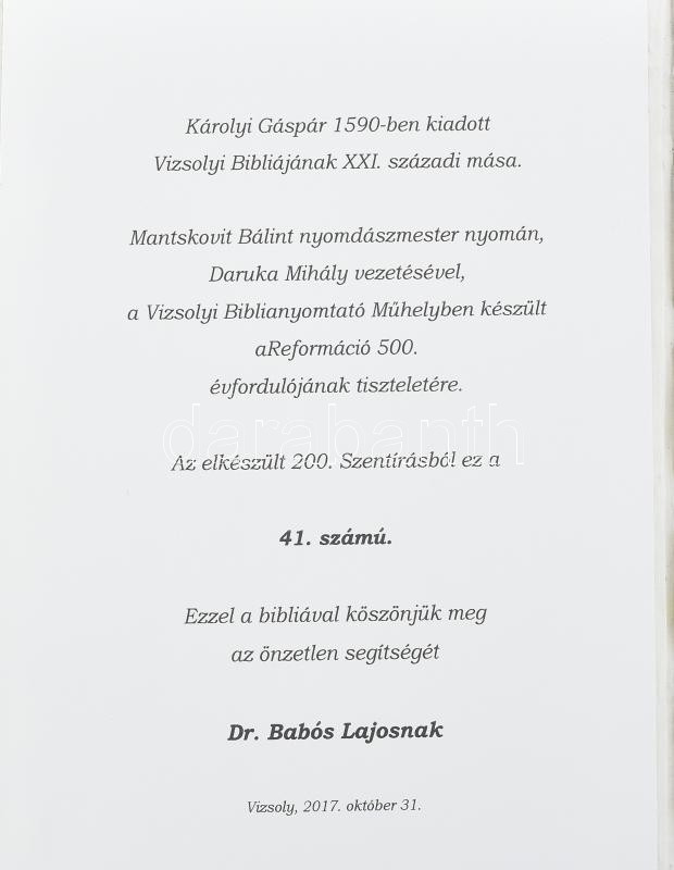 Szent Biblia, az az Istennec O es Wy testamentvmanac prophétác es apostoloc által meg iratott szent könyuei. Magyar nyelwre fordittatott [Károlyi Gáspár] egészben és wijonnan az Istennec Magyar országban való anya szent egyházánac épülésére. Károlyi Gáspár 1590-ben kiadott Vizsolyi bibliájának XXI. századi mása. Vizsoly, 2017, Daruka Mihály vezetésével a Vizsolyi Biblianyomtató Műhely, 2406 p. Kiadói bordázott egész kecskebőr-kötés, díszes rézveretekkel és rézkapcsokkal, merített papírlapokkal, festett lapélekkel. Számozott (41./200), névre szóló példány, 31x21x22 cm, 6 kg! Rendkívül igényes, manufakturális munka. Szép, gyűjtői darab. Daruka Mihály, a Vizsolyi Biblianyomtató Műhely vezetőjének célja, hogy 2017-re a reformáció 500 éves évfordulójára kinyomtat 200 bibliát. Mégpedig eredeti megjelenítésben, nyersanyagból és korabeli XVI. századi technikával. Az igazi célja, pedig nem a biblia kiadás, hanem az eredeti nyomtatás helyszínének, a vizsolyi Rákóczi-kúriának a helyreállítása volt. 2021-ben a "Jónak lenni jó" jótékonysági árverésén 3.000.000 forintért kelt el a 200 biblia egyike. Személyes átvétel ajánlott!