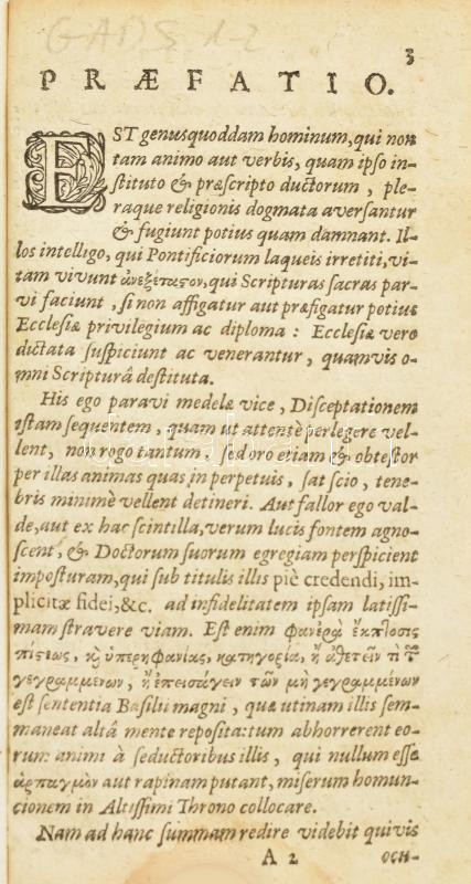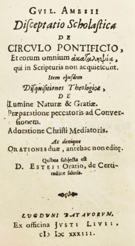 [William Ames/Gulielmus Amesius (1576 -1633)] Guil. Amesii disceptatio scholastica de circulo pontificio, et eorum omnium akatalepsia, qui in Scripturis non acquiescunt item ejusdem Disquisitiones Theologicae, de lumine naturae & gratiae praeparatione peccatoris ad conversationem adratione christi mediatoris. ... Lugduni Batavorum [Leiden], 1633, Ex officina Justi Livii, 93 p. Latin nyelven. Korabeli kartonált papírkötés, pótolt címlappal.