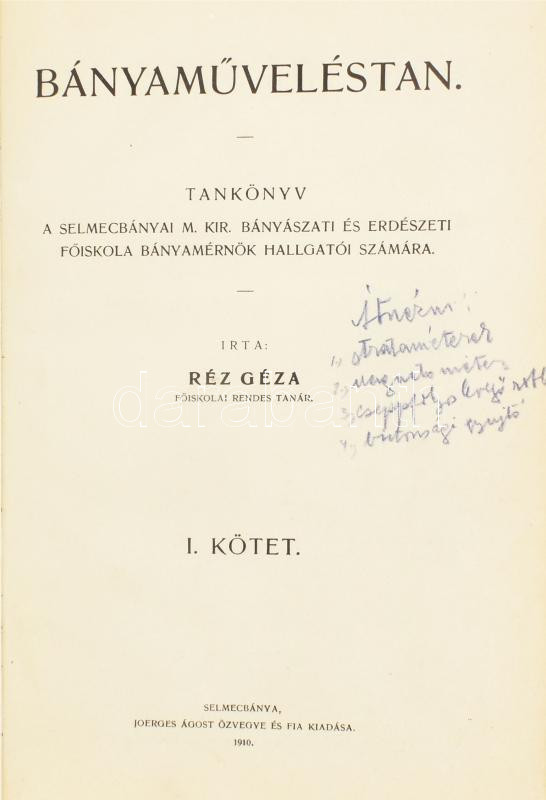 Réz Géza: Bányaműveléstan. Tankönyv a Selmecbányai M. Kir. Bányászati és Erdészeti Főiskola bányamérnök hallgatói számára. I. kötet. (Unicus, több kötete nem jelent meg!) Selmecbánya, 1910, Joerges Ágost özvegye és fia, VIII+(4)+385 p. + 2 (kihajtható) t. Szövegközi és egészoldalas képekkel, ábrákkal gazdagon illusztrált. Átkötött egészvászon-kötésben, jó állapotban.