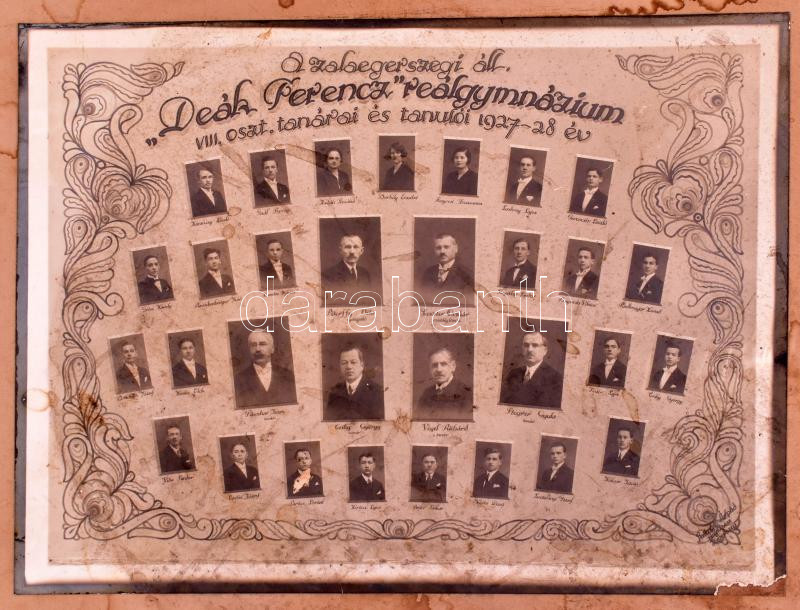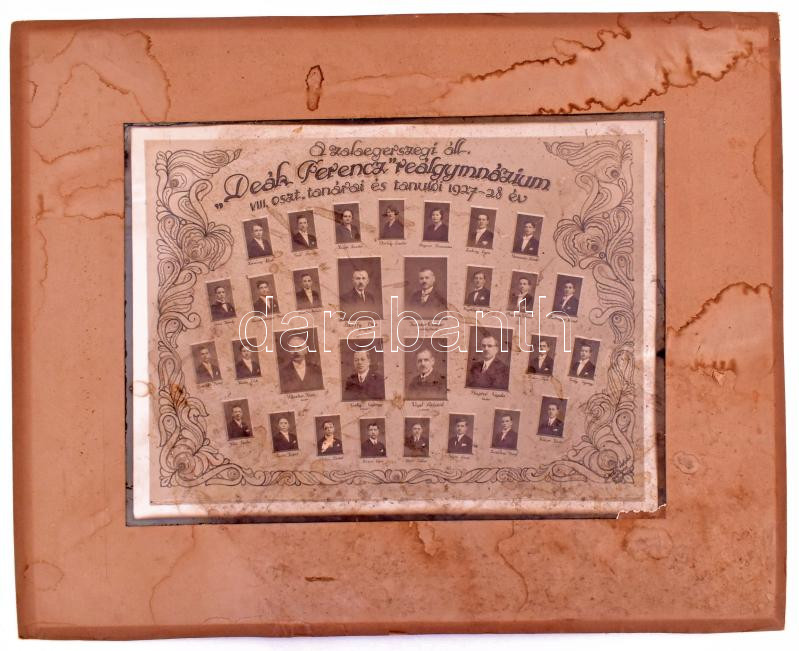 1928 A zalaegerszegi áll. Deák Ferencz reálgimnázium VIII. oszt. tanárai és tanulói 1927-28. év, tablófotó, Serényi Árpád fényképész Zalaegerszeg, foltos, kissé sérült, 28x21 cm