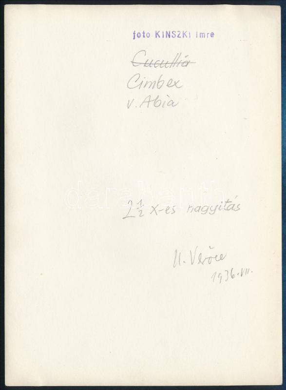 1936 Kinszki Imre (1901-1945) budapesti fotóművész hagyatékából pecséttel jelzett, feliratozott vintage fotóművészeti alkotás (N. Verőce, Cimbex v. Abia), 18x13 cm
