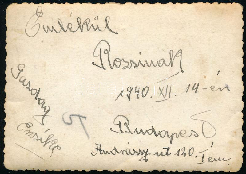 Beschreibung: 1940 Női motoros Zündapp motorkerékpáron, vélhetőleg Gazdag Erzsi költőnő, Bp. Andrássy út 120., szignózott, felületén törésnyom, 8,5×6 cm