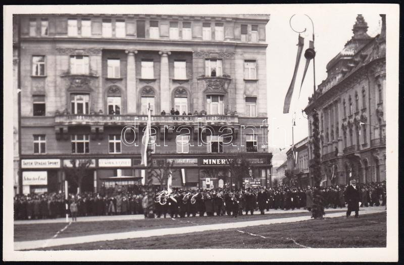 Beschreibung: 1942 Kolozsvár, levente felvonulás zenekarral, fotó, 13,5x8,5 cm
