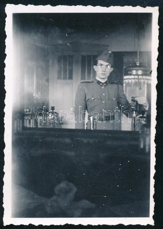 1943 Egy katona fotózza magát a tükör előtt, fotó, 9×6 cm https://www.darabanth.com/de/444-Fernauktion/444.0/Fotografie/Foto~500025/1943-Egy-katona-fotozza-magat-a-tukor-elott-foto-9C3976-cm~II2932559