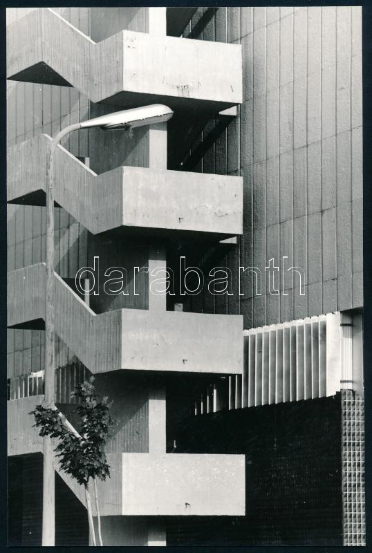 1974 Mihályi Gyula: Gemenc szálló (Szekszárd) című vintage fotóművészeti alkotása, feliratozva, ezüst zselatinos fotópapíron; a kép a Népművelési Intézet által, Szekszárdon megrendezett központi fotós alkotótelep (eredeti fotókat tartalmazó) albumából származik, 21,2x14 cm