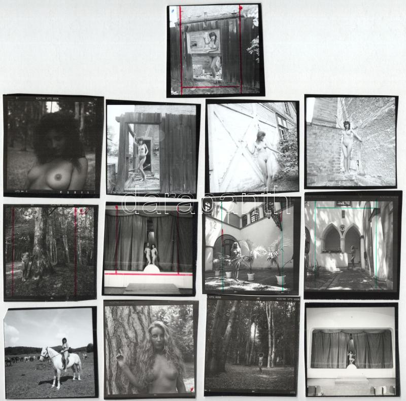 Beschreibung: Menesdorfer Lajos (1941-2005) budapesti fotóművész hagyatékából, 13 db vintage nézőkép aktfelvételekről, ezüst zselatinos fotópapíron, 6x6 cm