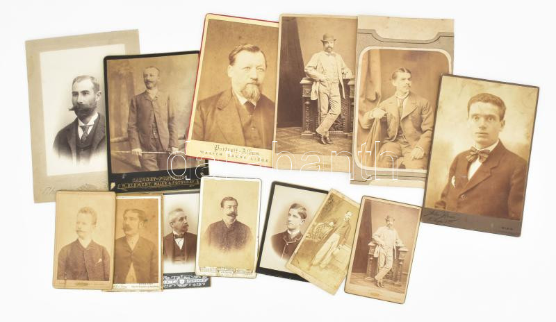 Beschreibung: Vegyes régi férfiportré tétel (kabinetfotók, vizitkártyák), 13 db, vegyes állapotban, 18,5x13 cm és 10x6 cm között