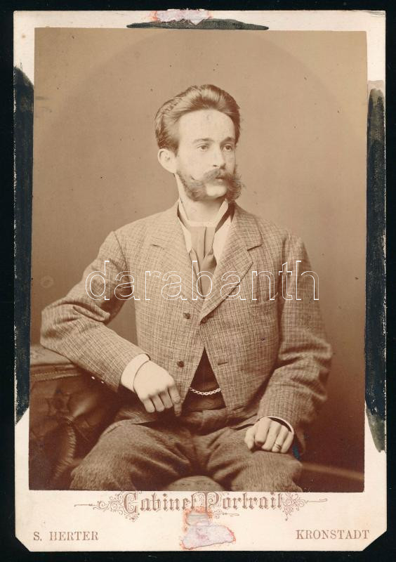 cca 1870-1880 Erdélyi úriember portréja, keményhátú kabinetfotó Herter Samu brassói műterméből (S. Herter Kronstadt / Brasov), szélén kis felületi sérülésekkel, alsó sarkai vágottak, 16x11 cm
