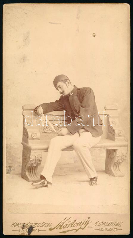 cca 1900 Császár Imre (1864-1933) színész, Alszeghy Irma színésznő férje, színiakadémiai tanár katonaruhás portréfotója, keményhátú fotó Mártonfy Gyula budapesti műterméből, a kartonon kis kopásnyomokkal, a fotó felületén folttal, 21x11,5 cm