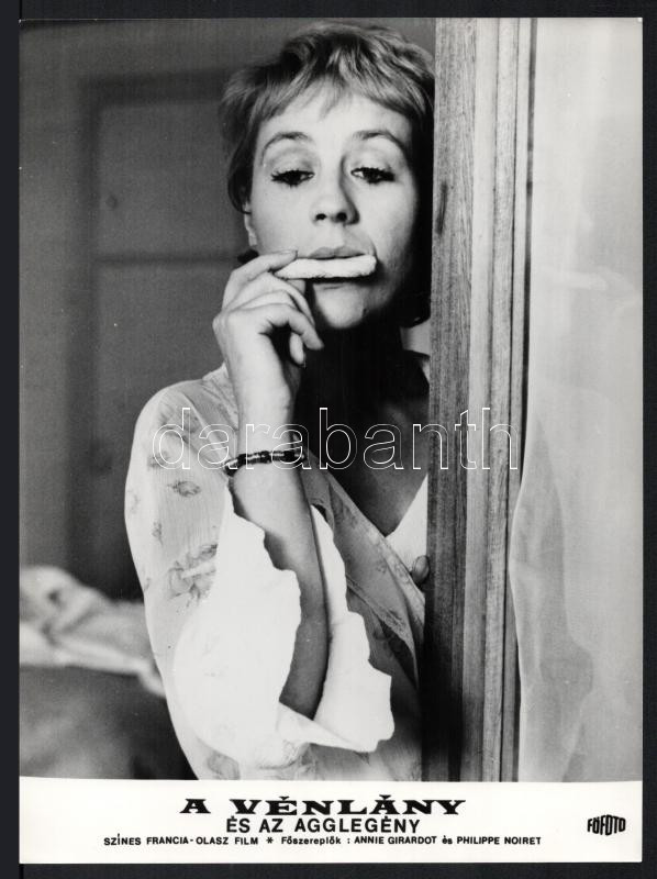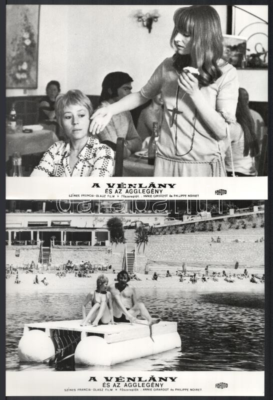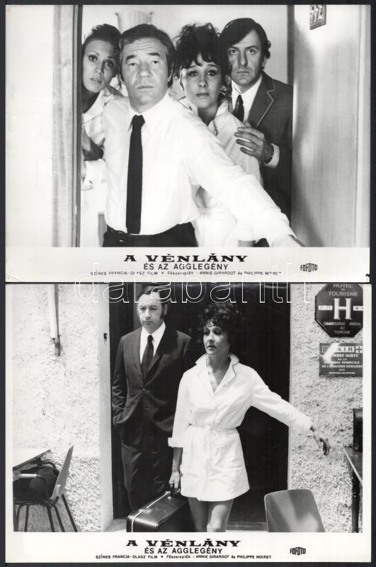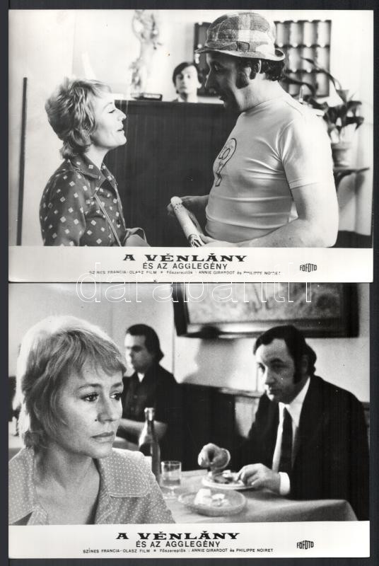cca 1971 ,,A vénlány és az agglegény" című francia - olasz film jelenetei és szereplői, 7 db vintage produkciós filmfotó ezüst zselatinos fotópapíron, a használatból eredő (esetleges) kisebb hibákkal, 18x24 cm