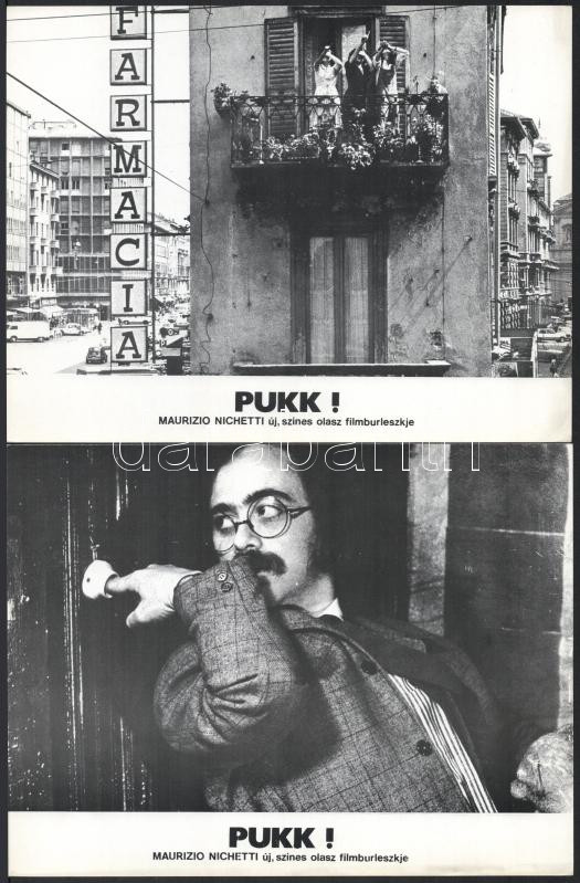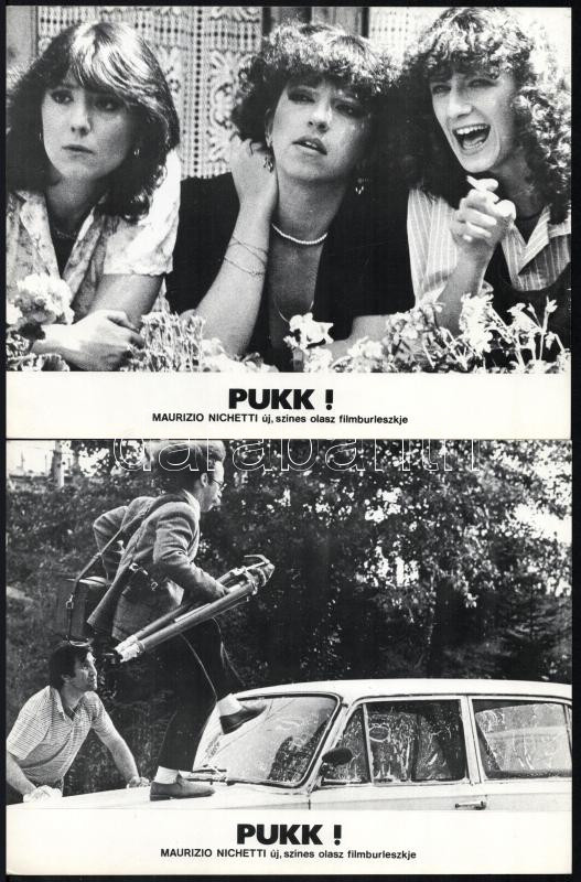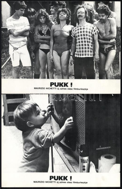cca 1981 ,,Pukk!" című olasz filmburleszk jelenetei és szereplői, 11 db produkciós filmfotó nyomdatechnikával sokszorosítva, egyoldalas nyomással, kartonlapra, a használatból eredő (esetleges) kisebb hibákkal, 18x24 cm