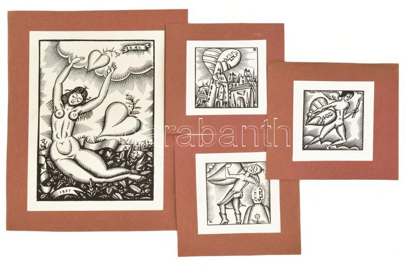 Kozma Lajos (1884-1948): 4 db fametszet, papír, jelzettek a metszeten,... https://www.darabanth.com/de/444-Fernauktion/444.0/Gemalde-und-Grafiken/Ex-libris-Kleingrafik~500004/Kozma-Lajos-1884-1948-4-db-fametszet-papir-jelzettek-a-metszeten-lapra-kasirozva-5x5-cm-es~II2932990